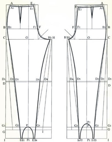 Построение передней половинки Строим прямой угол из точки А. АВ = высота линии бедер (Вб). (Пример: 18 см.) АС = длина сидения (Дс ). (Пример: 26 см.) AD = высота линии колена (Вк ). (Пример: 59 см.) АЕ = длина брюк (Ди ). (Пример: 96 см. Подробнее...